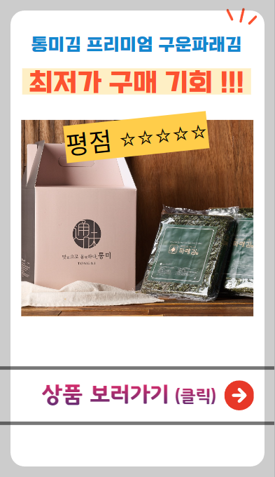 👉 통미김 선물세트의 특별함! 🎁 고품질의 구운 파래김으로 입맛을 사로잡아요. 고소하고 깔끔한 맛이 일품이라 가족, 친구들에게 선물하기에도 제격입니다.