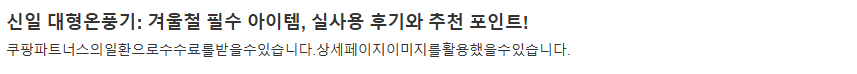 "신일 대형온풍기"를 사용해본 결과, 성능과 디자인 모두에서 매우 만족스러운 제품이었어요. 겨울철 따뜻함과 안정성을 동시에 챙길 수 있는 이 온풍기는 제게 겨울철 필수 아이템으로 자리 잡았습니다. 이제 온풍기를 사용하며 편안하고 따뜻한 겨울을 보내게 되었습니다. 여러분도 겨울철 온풍기를 찾고 있다면 신일 대형온풍기를 고려해보세요! 후회하지 않으실 거예요 😊