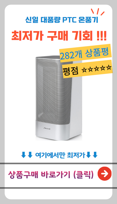 현재 별점 4.3점, 리뷰 282개를 가진 신일 대풍량 PTC 온풍기! 지금 쿠팡에서 더 저렴하고 다양한 온풍기 제품들을 확인해보세요.