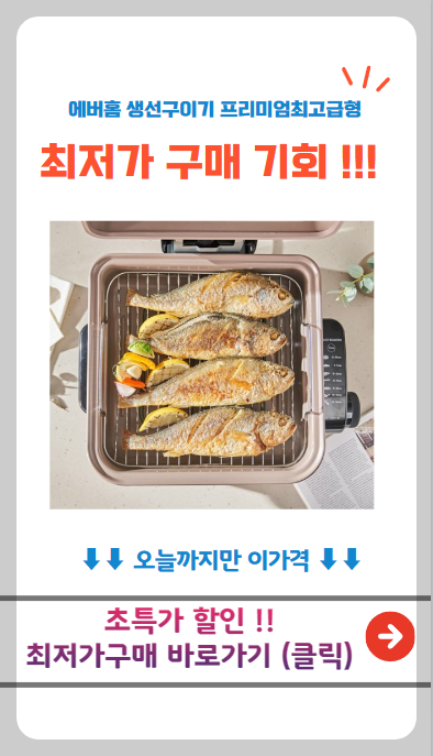👉에버홈 생선구이기만 있으면 간편한 집밥 완성! 기름 없이도 바삭하고 촉촉한 생선구이를 손쉽게 만들 수 있어요. 냄새나 연기 걱정 없이 건강하고 맛있는 요리! 지금 바로 확인 해보세요~!!🔽🔽🔽