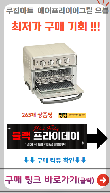 👉 쿠진아트 에어프라이어 그릴 오븐 17L, 요리의 모든 것! 이젠 오븐과 에어프라이어, 그릴까지 하나로 끝내세요! 고기부터 빵, 야채까지 완벽하게 익혀주니 바삭하고 촉촉한 맛을 집에서 즐길 수 있어요. 주방 공간도 절약되고 요리 시간도 확 줄여줘서 너무 편리하네요! 요리 초보도 쉽게 사용할 수 있어 추천드려요! 아래 링크에서 자세히 확인해 보세요!