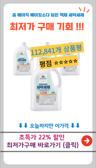 현재 별점 4.7점, 리뷰 112893개를 가진 줌 베이직 베이킹소다 담은 액체 세탁세제, 4.21L, 4개! 지금 쿠팡에서 더 저렴하고 다양한 액체세제 제품들을 확인해보세요.