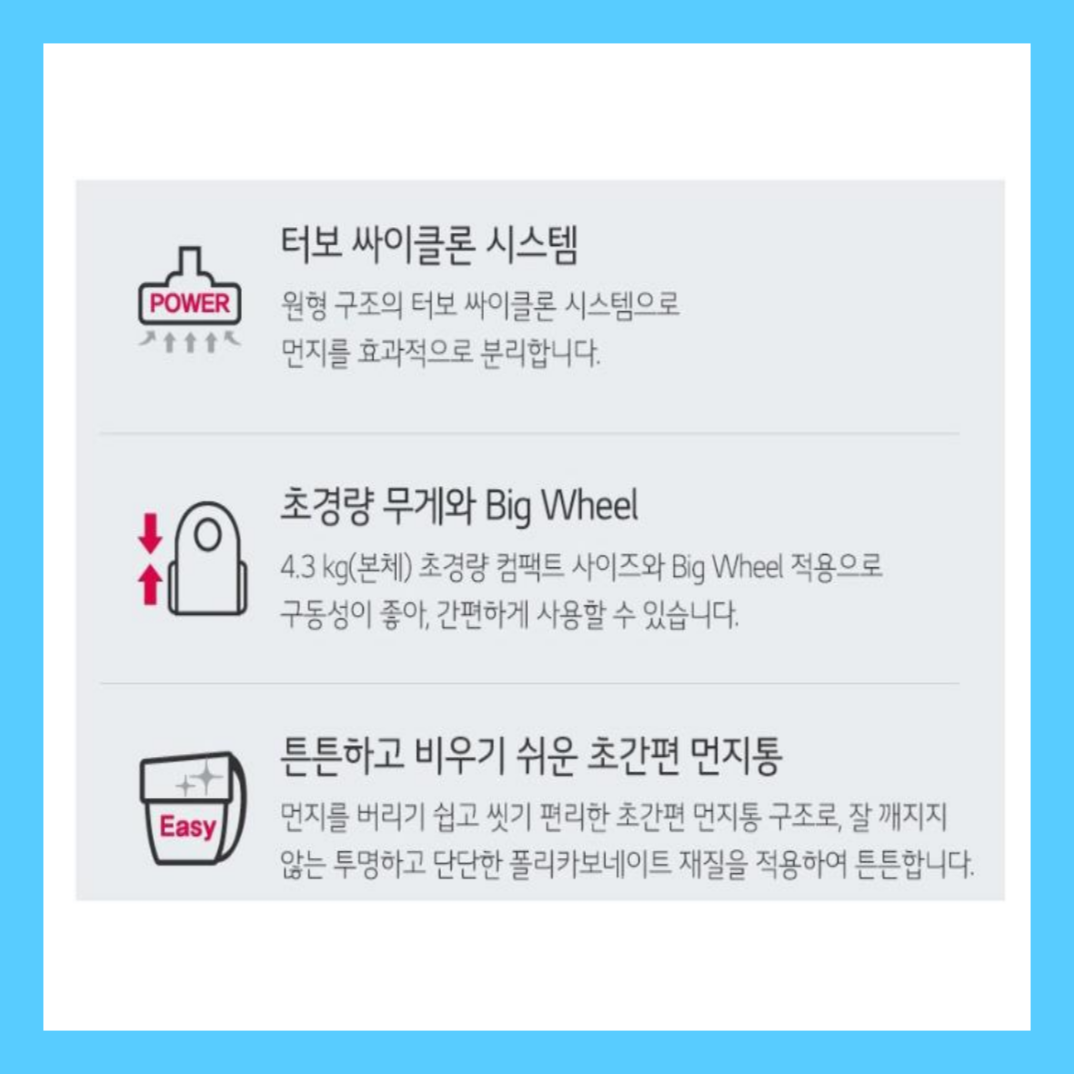 먼저 엘지 유선청소기 디자인부터 이야기해볼게요. 엘지 유선청소기는 깔끔하고 세련된 외관을 가지고 있어요! 일반적인 진공청소기와는 달리 유선형의 디자인 덕분에 공간 활용도가 좋아 보였어요. 색상도 은은한 블루와 화이트 조합이라서 집안 인테리어와 잘 어울렸답니다.